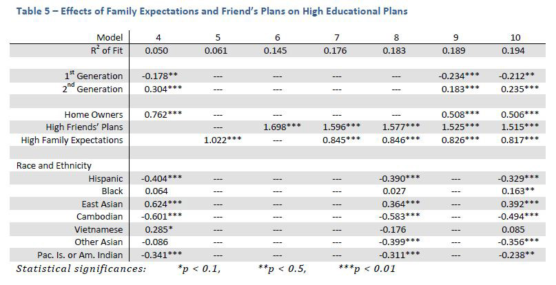 In my research, I draw upon these theories to examine the effects of acculturation on the higher educational aspirations and attainment of the children of immigrants relative to comparable youth of native born parents. Using data from the Beyond High School study, conducted by the University of Washington, Department of Sociology, I also examine the effects of peer and parent expectations on the development of college aspirations. The goal of this research is to gain is a clearer understanding of the role of community factors on immigrant assimilation.