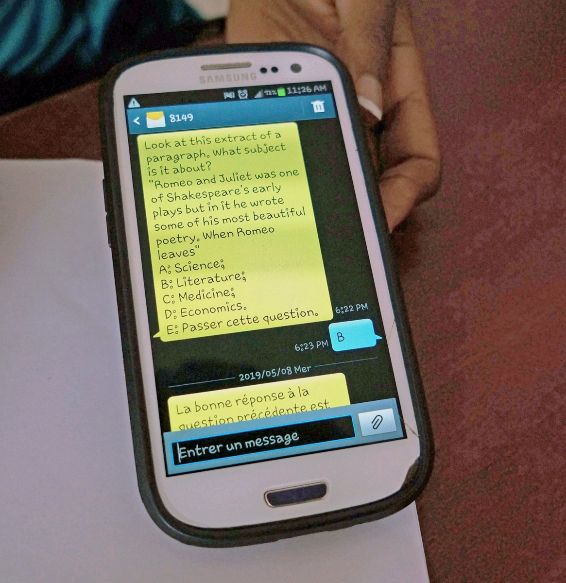 In Cameroon, no exam is more important than the baccalauréat, which serves as the gateway to adulthood and professional and higher-education aspirations. We build on existing literature on the benefits of practice tests to evaluate how SMS-based quizzes could help students in their final year of secondary school prepare for the baccalauréat. Students in 23 schools across Yaoundé, the capital of Cameroon, received multiple-choice questions four times per week for nine weeks leading up to the exam date. We examined baccalauréat pass rates and student feedback through 11 focus groups. We find that students used our practice tests for formative assessment and as a prompt for recall and review of study material. SMS-based quizzes were not isolated artifacts but were shared in the students’ networks, built a distributed learning environment, and used as a focus of collaborative study sessions.