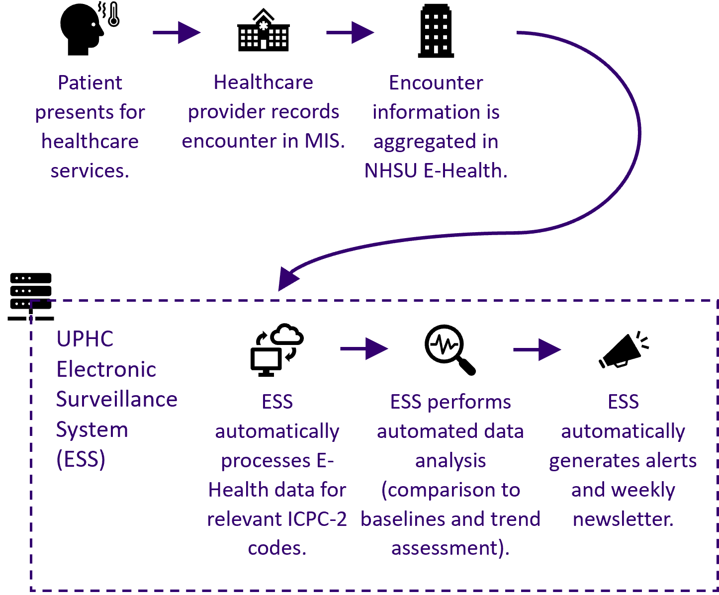 ESS is a novel, integrated, digital public health tool for Ukraine that is modular and expandable. Previously, public health surveillance for infectious diseases and sentinel surveillance relied on healthcare workers calling local health officials before this data was aggregated to the national level. This manual process introduced the potential for data errors and delays. In its enactment, ESS digitized these existing surveillance processes. ESS provided reporting capabilities directly accessible to healthcare workers to minimize delays and provided new data analysis and visualization tools to public health officials to more easily identify the potential occurrence or spread of a disease.